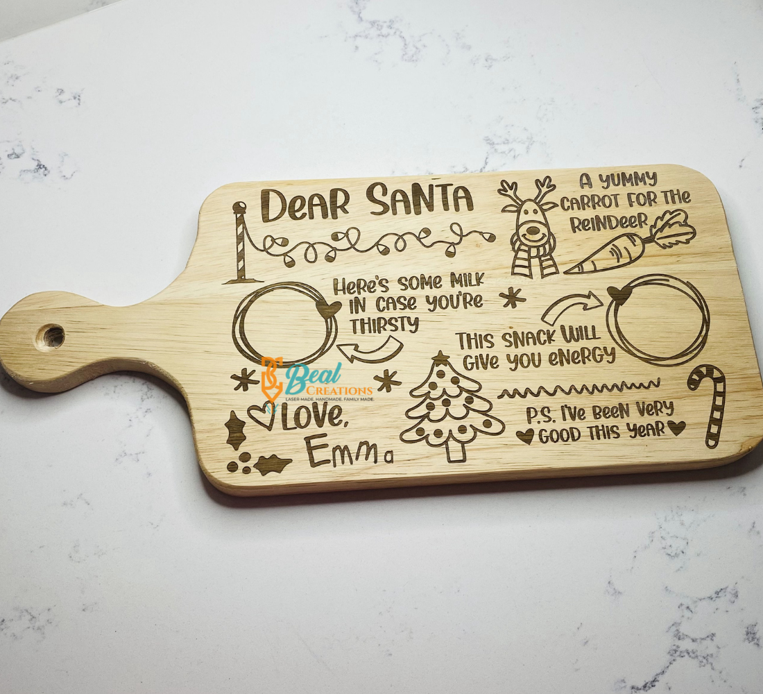This Santa Board is made from a charcuterie board made for restaurants, so you know it will last. We engrave everything, including your child’s or family name. After engraving we finish with Butcher Block Conditioner. Recommended use is for leaving Santa treats and wiping clean when finished; do not submerge in water. We do not recommend using this board for cutting, as it can ruin the engraving.