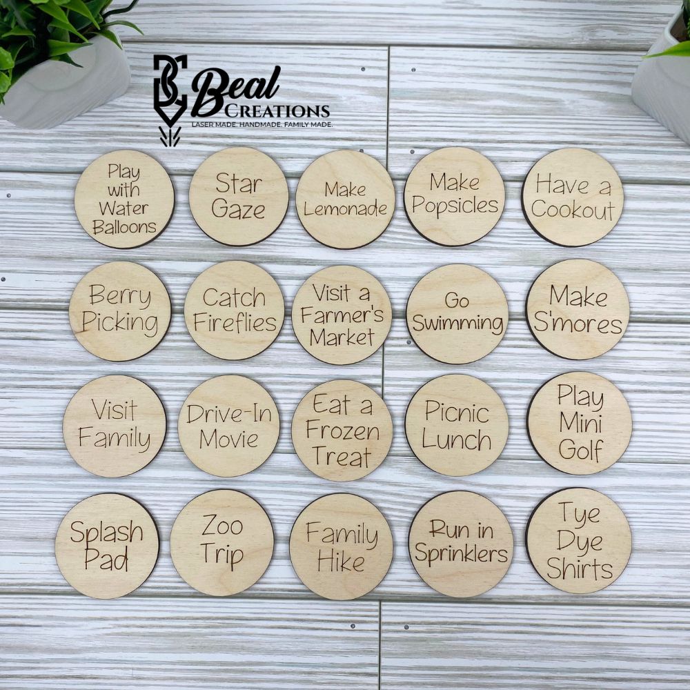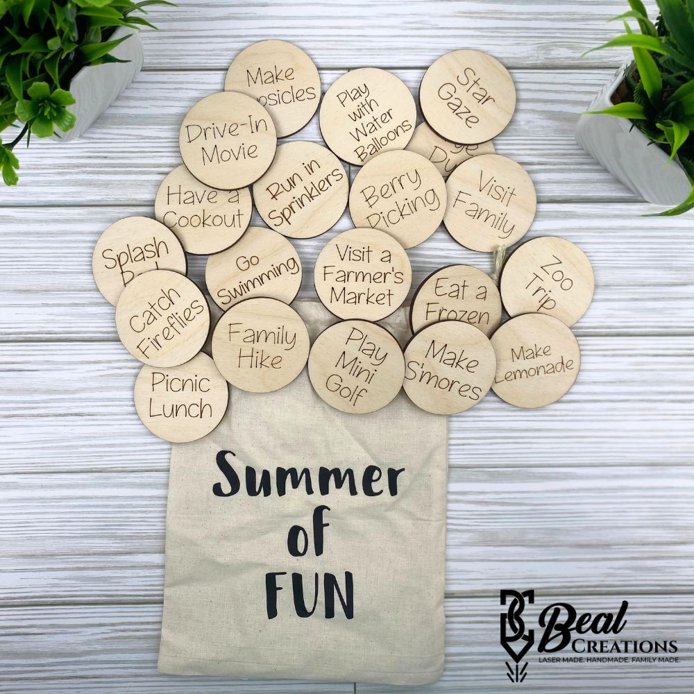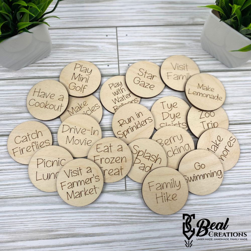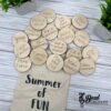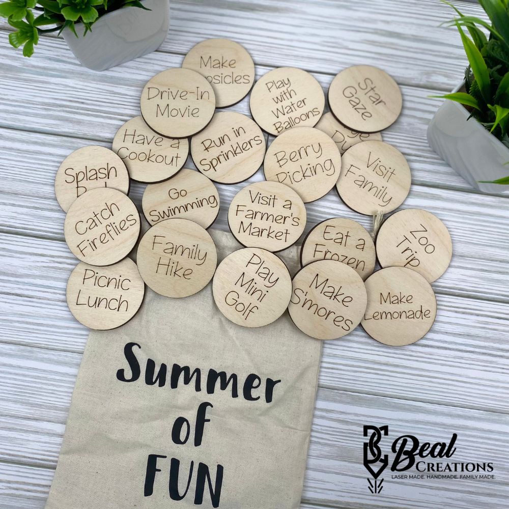 Tokens are made from 1/8″ Baltic Birch wood and measure approximately 2″ in diameter. Words are engraved into wood. Tokens come in muslin bag with “Summer Tokens” applied with heat-transfer vinyl.